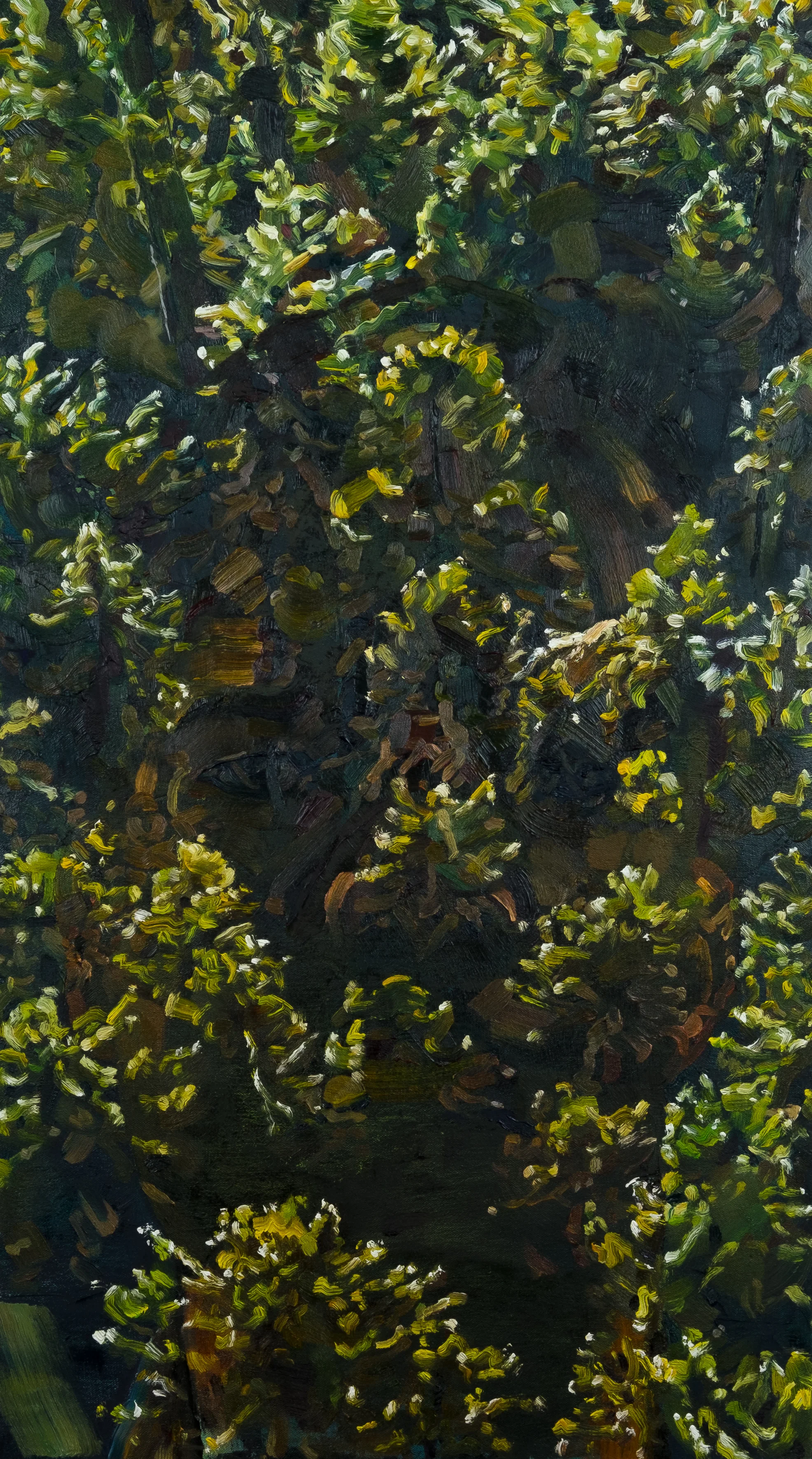 As we become more dependent on technology, our ability to reflect on how we interact with the world diminishes. Smartphones seamlessly integrate technology into our daily lives, simultaneously opening windows to new realities while closing the ones immediately around us. While peering into these new realities, we forget that the windows double as mirrors, constantly reflecting our relationship with the virtual. Our ability to virtually "visit" people and places often supplants our need to experience them physically. These visits are surreal: closely resembling reality, but constantly reminding us of the synthetic medium. Similarly, the painted depictions of these reflections are realistic and detailed, and yet gestural brushstrokes keep the fabricated nature of the paintings in focus. This series addresses the ways we experience our lives in an age where there is no time or perspective for intentional self-reflection.